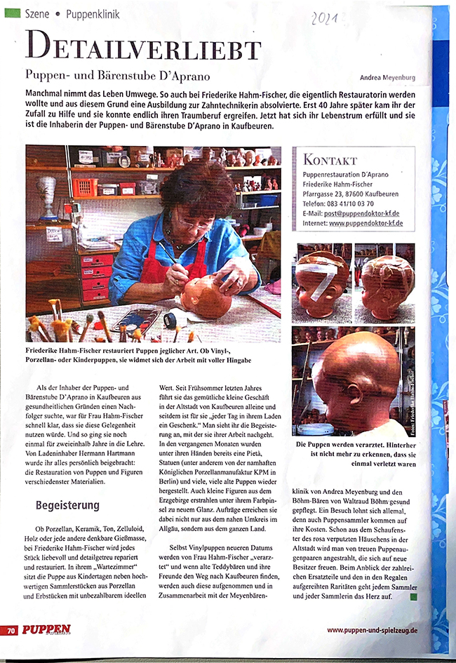 Mehr als 26 Jahre widmete sich Hermann Hartmann mit Begeisterung der original-getreuen Restaurierung von antiken Puppen und Kunstgegenständen aller Art. Leider verstarb er nach schwerer Krankheit im Oktober 2018.